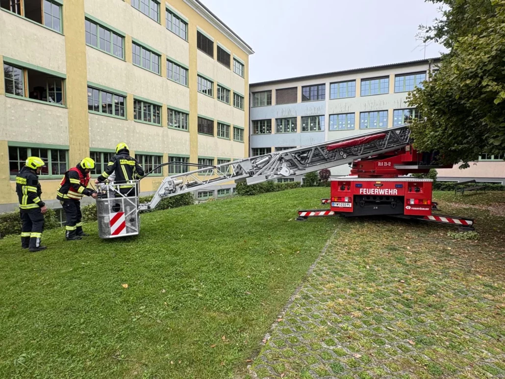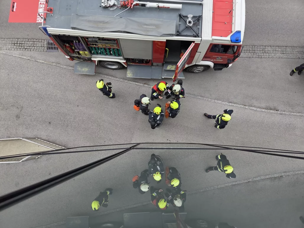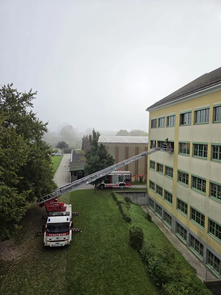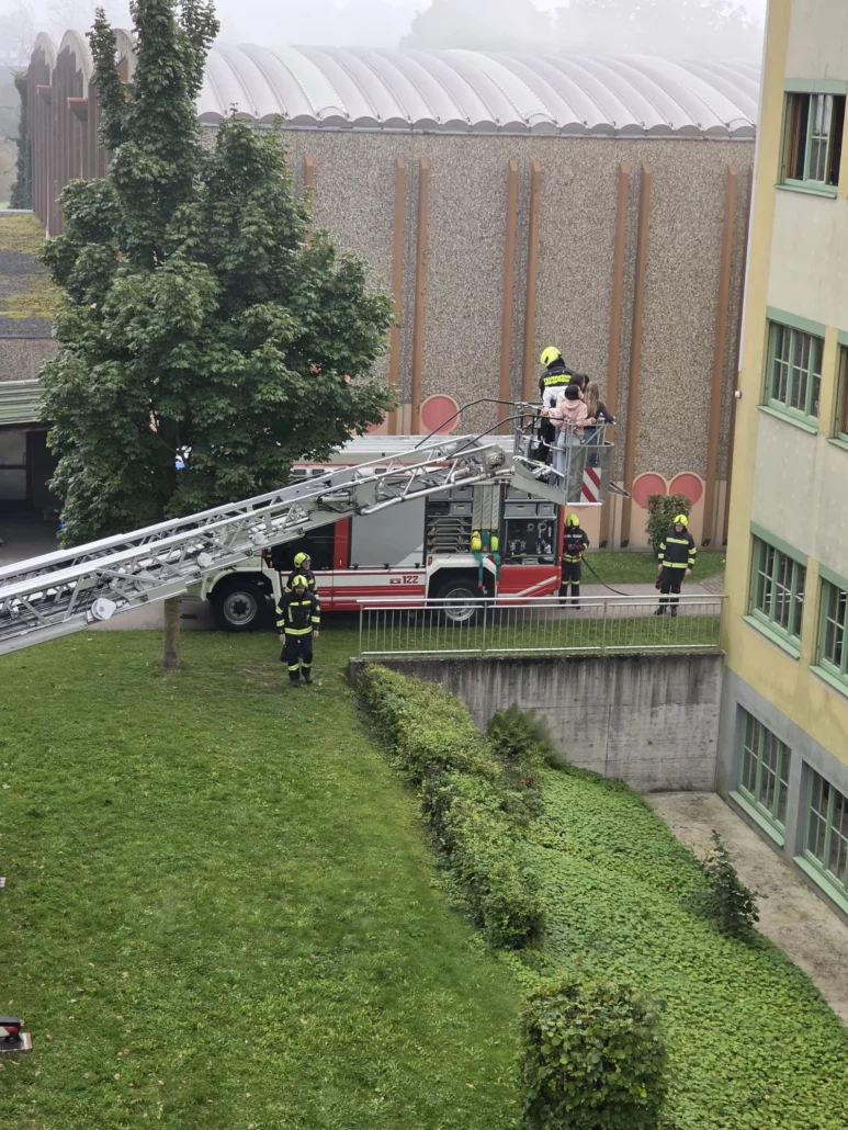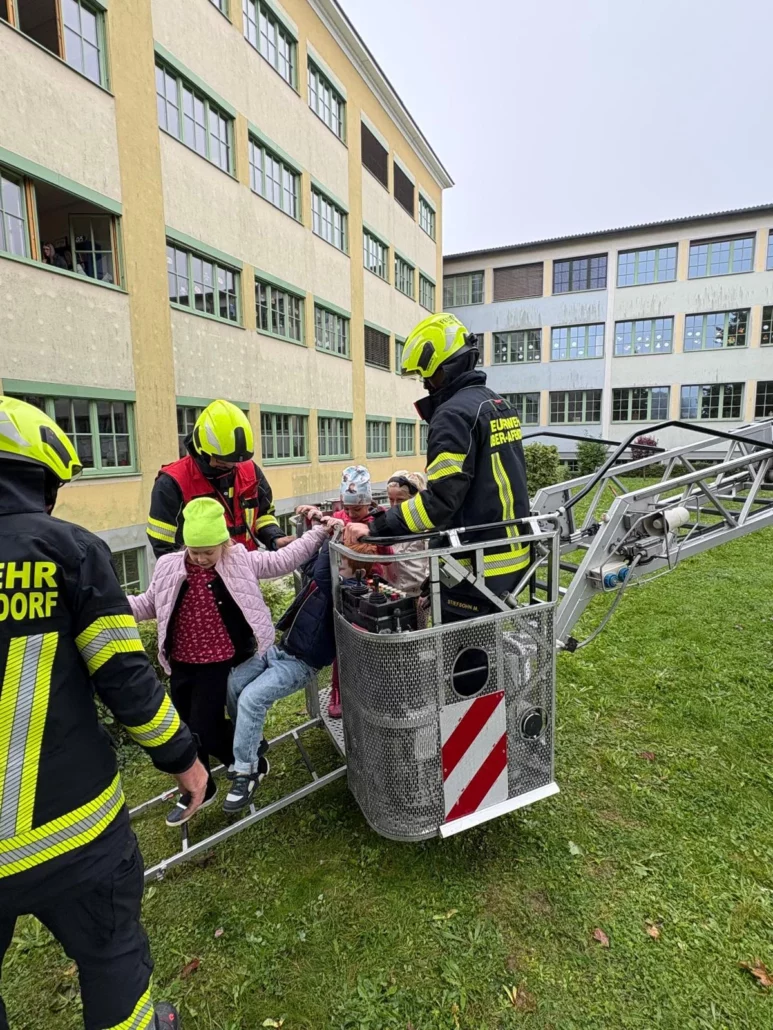 Während einige Trupps mit Atemschutz ins Gebäude gingen, um „Vermisste“ zu suchen, wurde draußen die Drehleiter ausgefahren. Über die hohen Fenster wurden die vom Rauch eingeschlossenen SchülerInnen schnell und sicher „gerettet“.