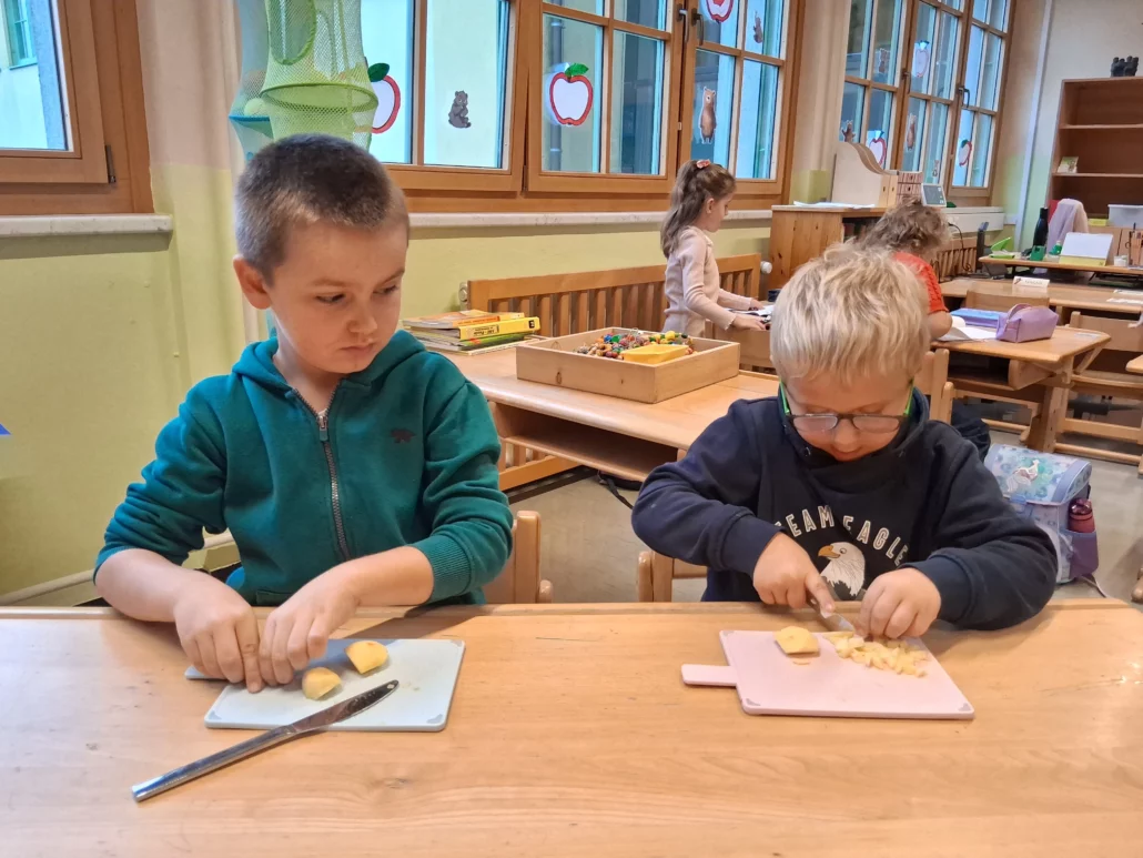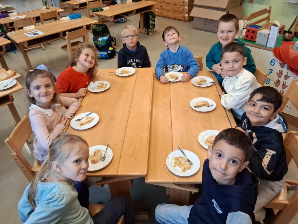Zusammen lernten wir den Zyklus eines Apfelbaums kennen. Die Teile des Apfels wurden benannt und gemeinsam überlegten wir, was aus Äpfeln alles hergestellt werden kann. Außerdem schmücken jetzt gebastelte Apfelbilder unsere Fenster. Die SchülerInnen betrachteten ein Bilderbuch sowie ein Sachbuch über den Apfelbaum. Auch ein passendes Lied und ein Gedicht wurden erlernt. Ein besonderes Highlight war das Backen eines Apfelstrudels! Die Kinder durften Äpfel schälen, schneiden und beim Zubereiten helfen. Zum Abschluss wurde der Apfelstrudel gemeinsam gegessen.
