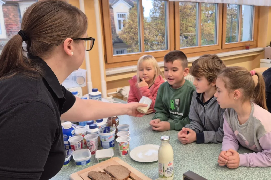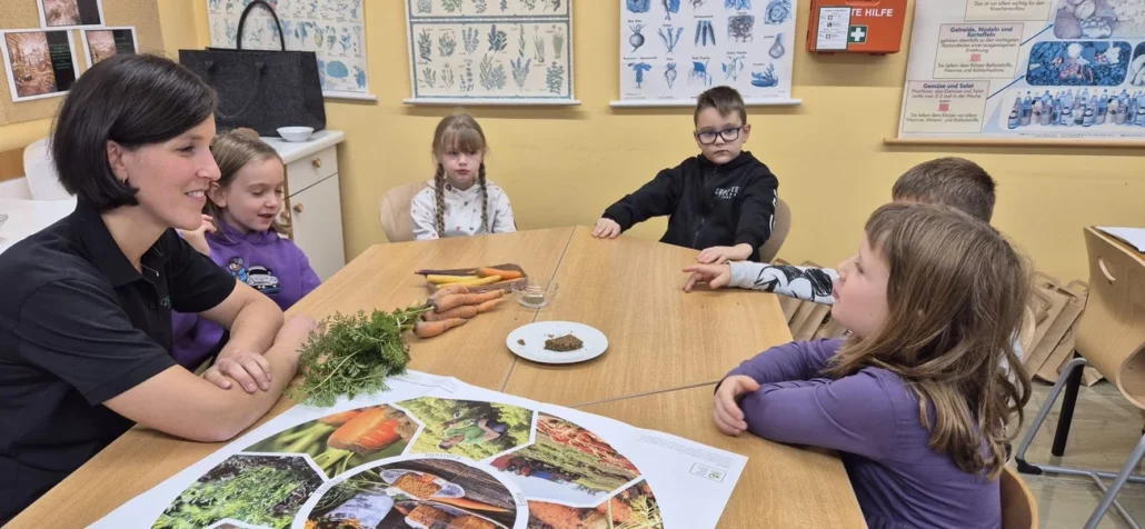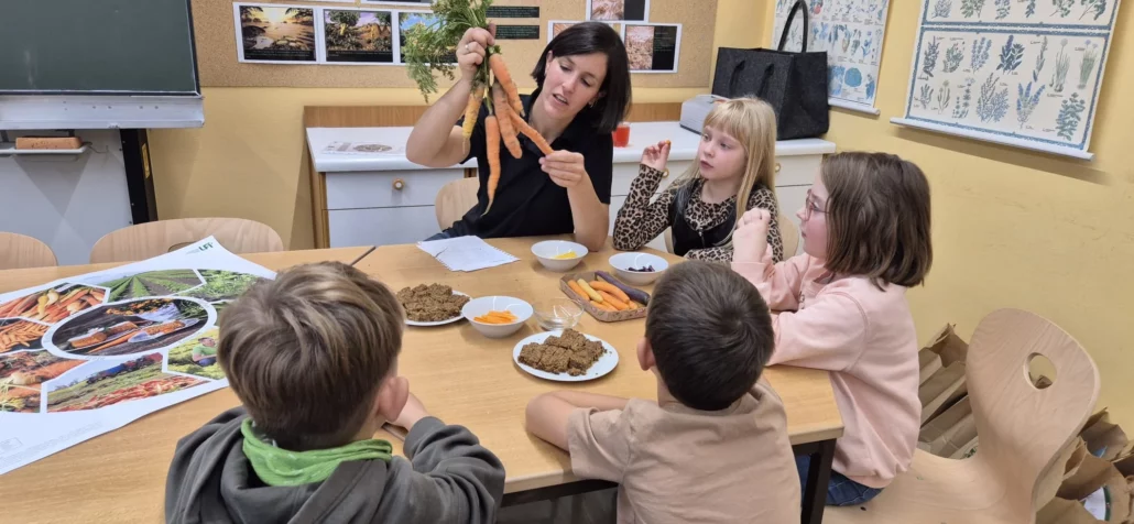 An mehreren abwechslungsreichen Stationen konnten die Schülerinnen und Schüler aktiv mitarbeiten und viel Neues entdecken. So wurde beispielsweise Butter selbst geschüttelt, wodurch die Kinder hautnah erleben konnten, wie aus Schlagobers frische Butter entsteht. An einer weiteren Station drehte sich alles um die Karotte – von der Aussaat bis zur Ernte und den vielfältigen Verwendungsmöglichkeiten. Auch die Entstehung von Honig wurde anschaulich erklärt: Die Kinder erfuhren, wie Bienen arbeiten, wie Honig entsteht und warum sie für unsere Umwelt so wichtig sind.