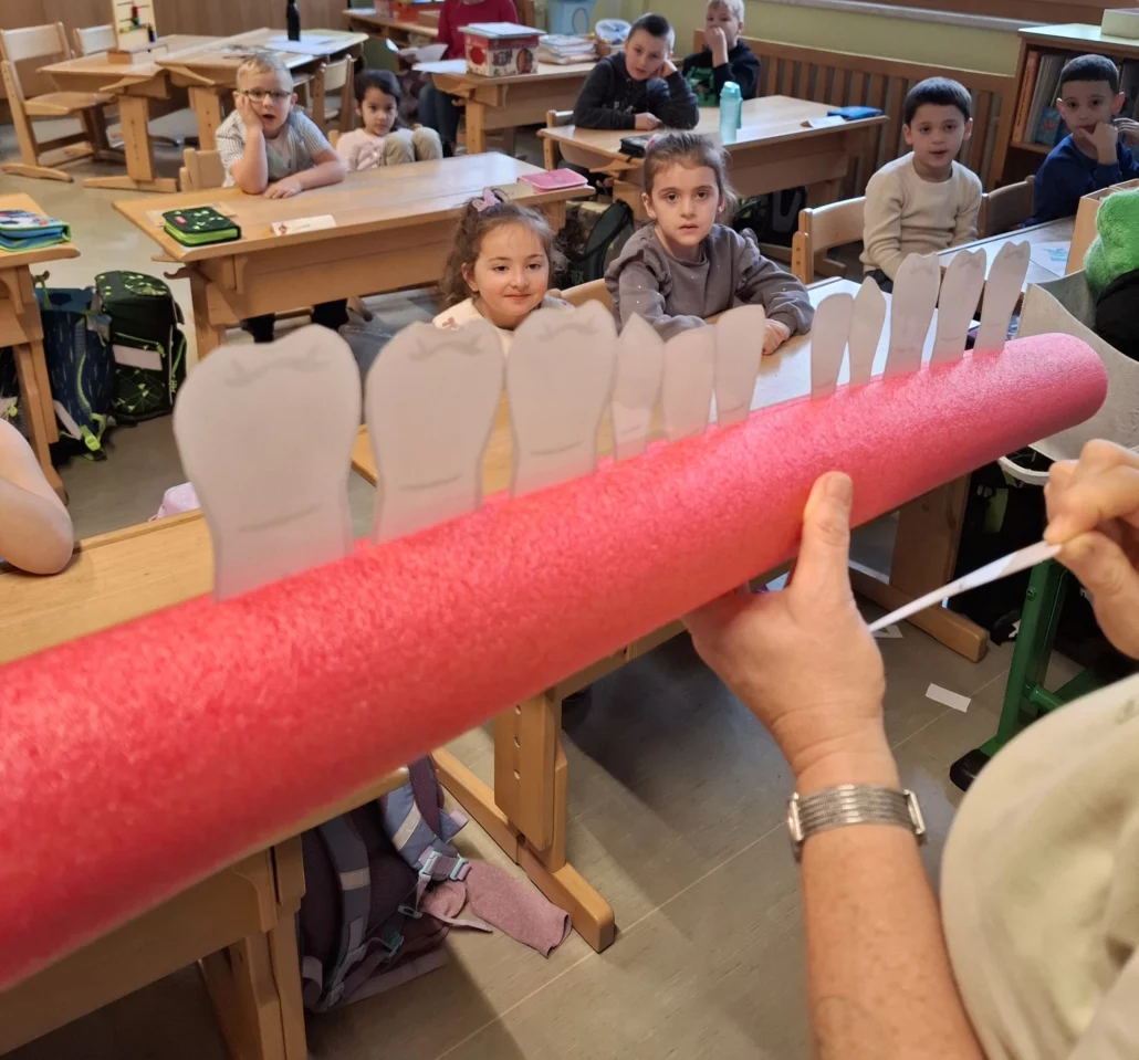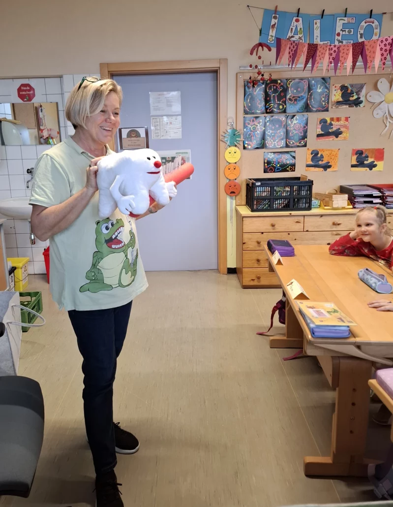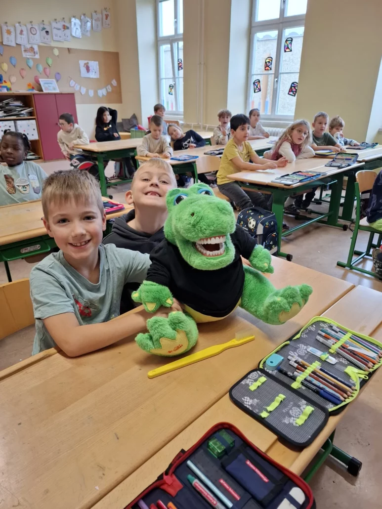 Mit viel Spaß und Begeisterung erfuhren die Kinder, warum Zahnhygiene so wichtig ist und wie man richtig Zähne putzt, um sie gesund und stark zu halten. Kroko zeigte gemeinsam mit der Zahngesundheitserzieherin auf spielerische Weise, wie man sich um seine Zähne kümmern kann und sorgte dabei für viele lachende Gesichter! 😄