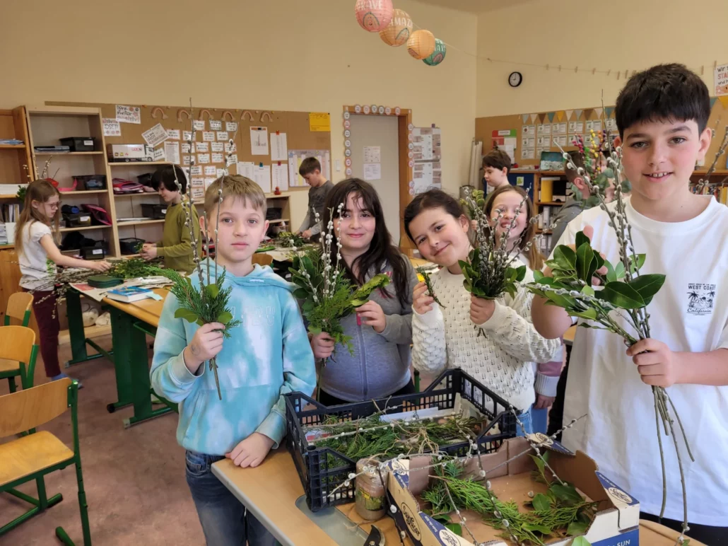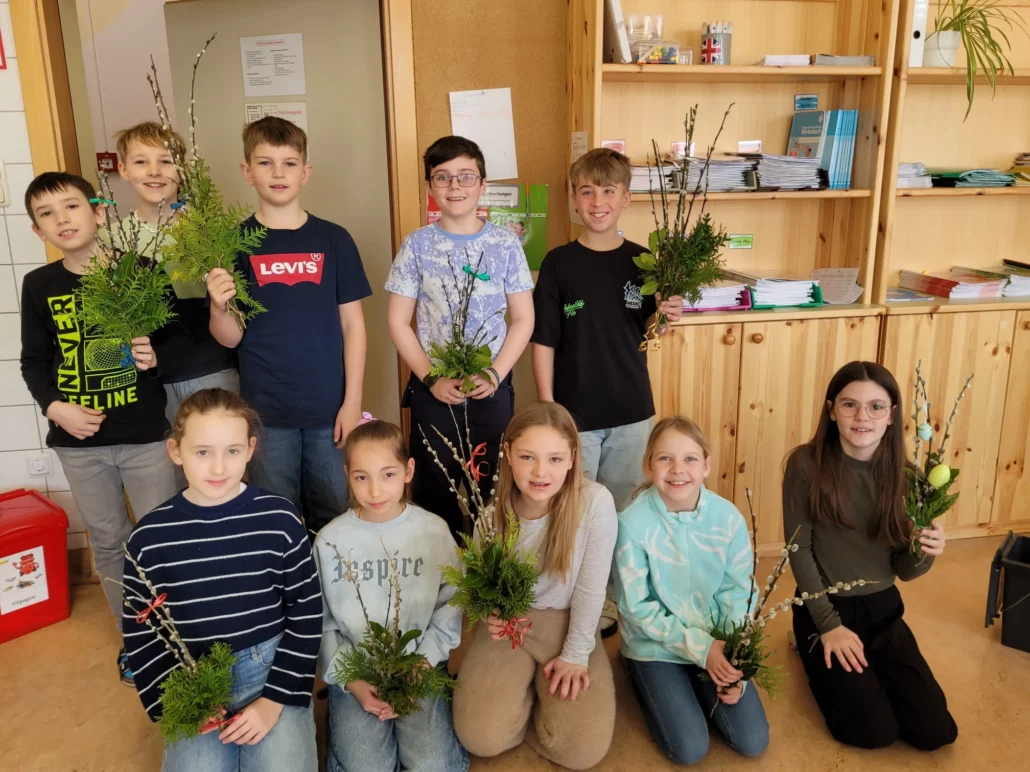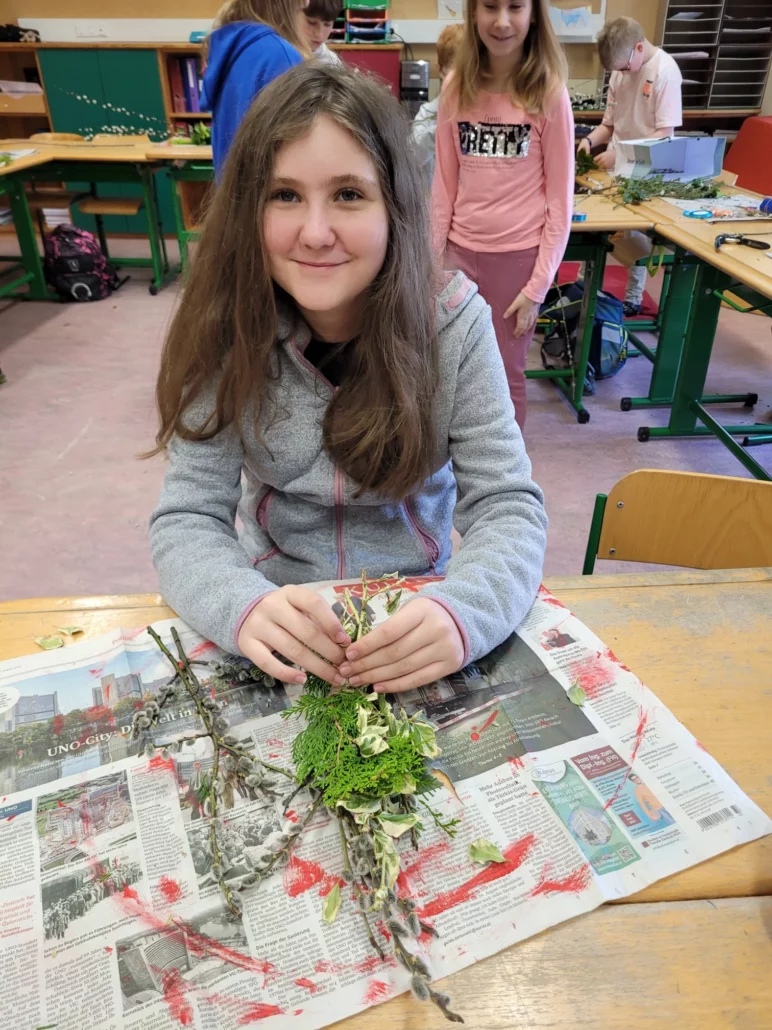 Ein schönes Beispiel ist das gemeinsame Binden von Palmbuschen. Die Kinder gestalten mit Zweigen und bunten Bändern ihre eigenen Sträuße und lernen dabei die Bedeutung des Festes kennen. Gleichzeitig werden Kreativität, Gemeinschaft und regionale Traditionen gestärkt.