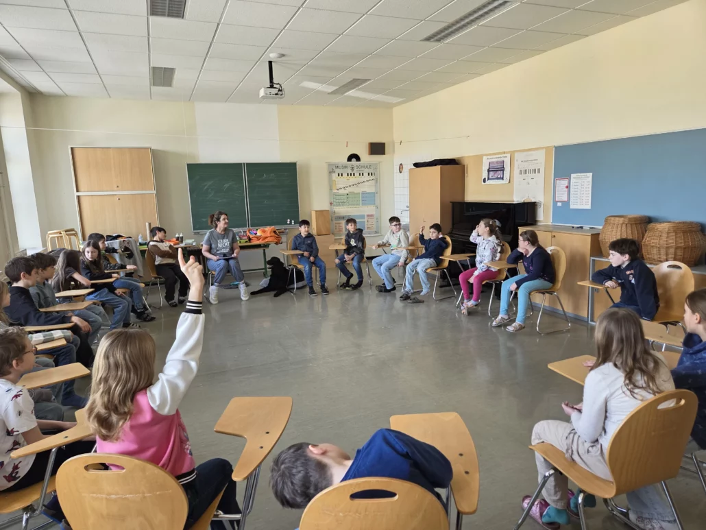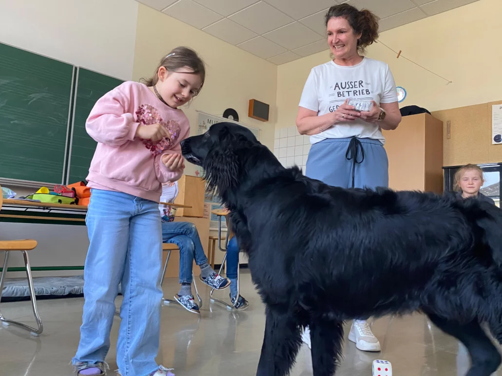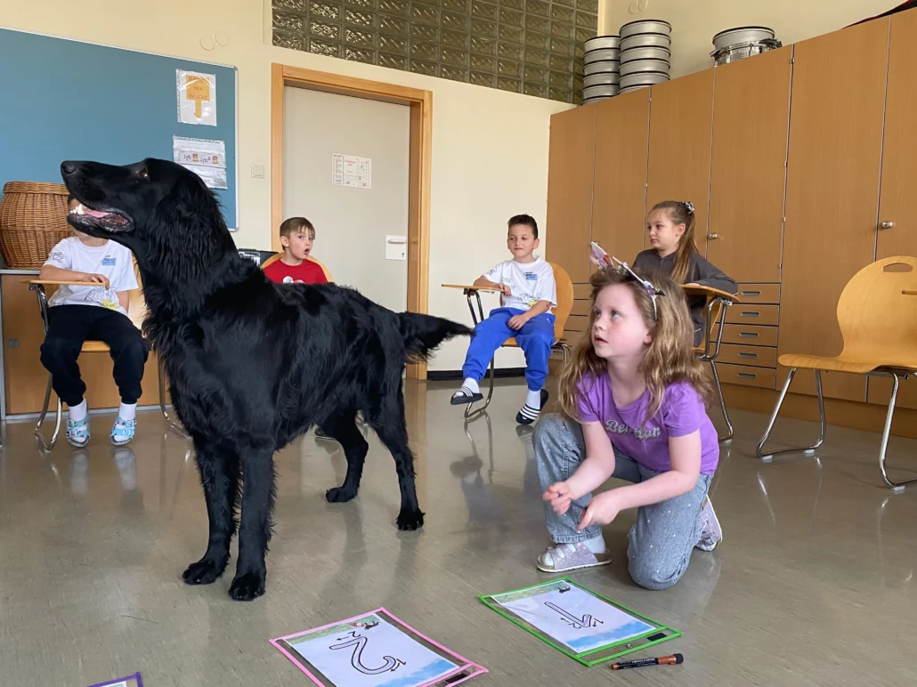 Die Kinder unserer Volksschule durften in den Wochen vor Ostern einen ganz besonderen Gast begrüßen: Therapiehund Aragon.